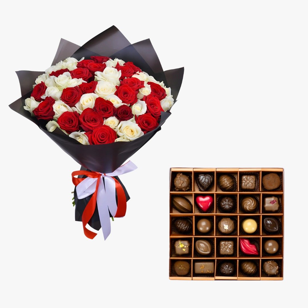 Ce coffret associe un bouquet de fleurs rouges et blanches à une boîte de chocolats artisanaux, pour un cadeau aussi doux que raffiné.